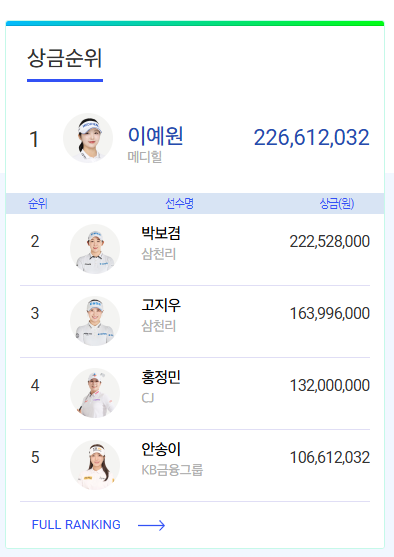 KLPGA 투어는 한국의 여자 골프 리그로, 매년 많은 선수들이 경쟁하며 상금을 획득하고 있습니다. 현재 상금 순위는 시즌의 진행 상황에 따라 실시간 변동되고있습니다.