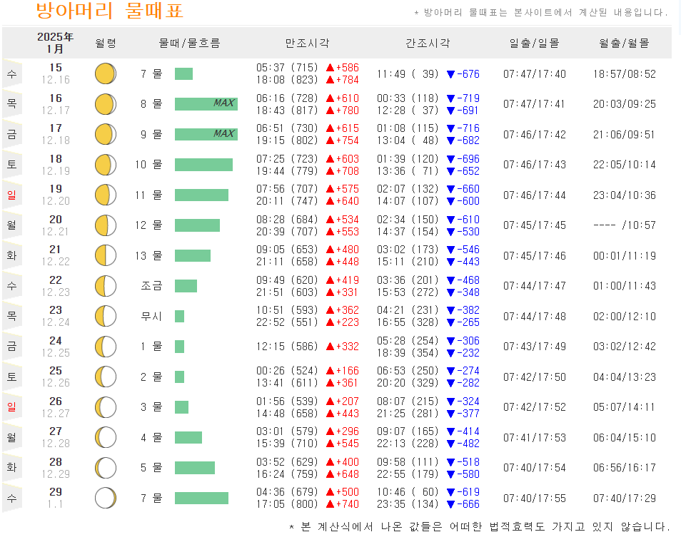 | 조석 | 물이 들어오고 나가는 시작점의(만조, 간조)일별 시간표시 |