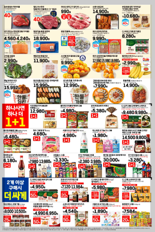 신선한 제철 과일과 채소, 육류, 수산물부터 가공식품, 생활용품, 주류, 신학기 필수품까지 다양한 제품을 할인된 가격으로 만나볼 수 있습니다.