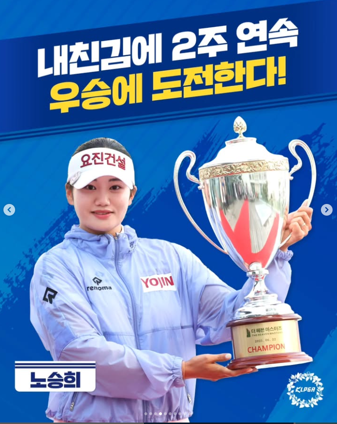 가장 강력한 우승 후보는 노승희(24, 요진건설산업)입니다. 지난주 '더 헤븐 마스터즈'에서 최종라운드 6타를 줄여내며 극적인 역전 우승을 차지한 그녀는: