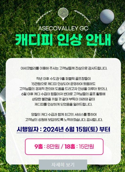 아세코밸리CC는 수도권 안에 위치한 가성비 좋은 골프장으로서 거리가 가깝고 야간이 아주 잘되어있어서 골프 매니아분들이 평소 자주 찾는 수도권 골프장 중에 하나입니다. 코스설계도 잘되어있어서 비교적 난이도있는 다양한 코스 경험을 하실수가있습니다.2024년 7월 그린피,카트비,캐디피 안내해드립니다. 인기있는 시간대는 금방 마감이되기때문에 예약은 티 오픈과함께 서두르셔야 합니다.