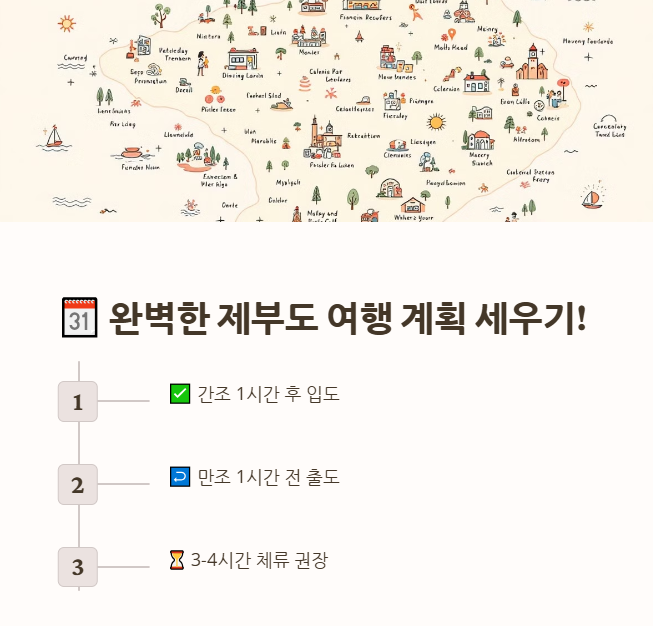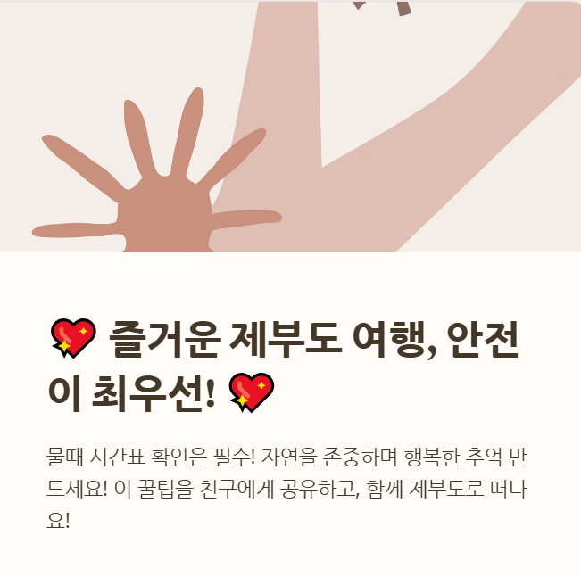 🔹 제부도는 하루에 2번 만조와 간조가 반복되며, 방문 전 반드시 물때 시간표를 확인해야 합니다!