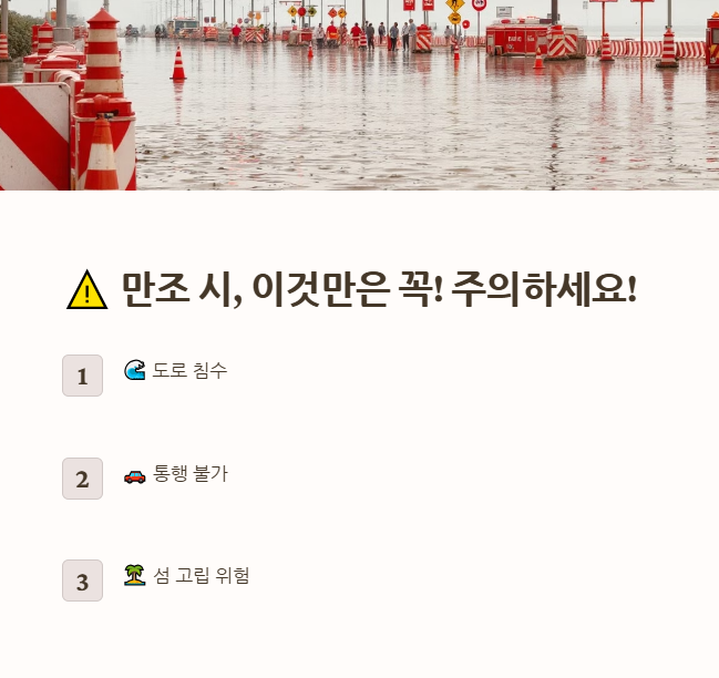 - 도로 위 정차 시 침수 위험 🚨 (특히 밀물 도중 도로 이용 시 위험!)