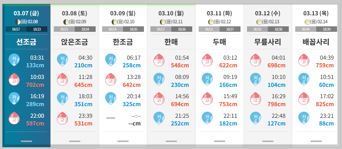 | ▲+172 | 물이 가장 많이 차 올랐을 때를 말하며 '+숫자'는 간조 이후 차오른 해수면 높이의 차이를 말합니다. |