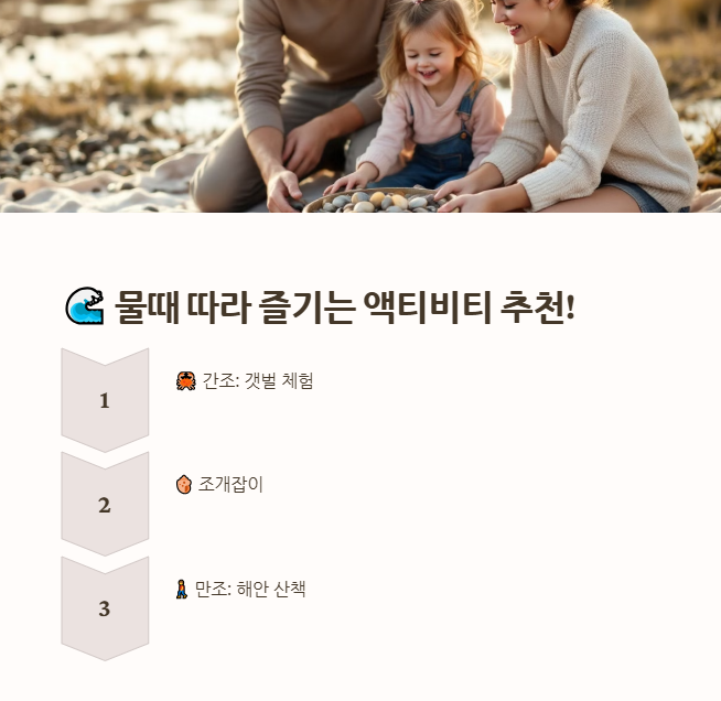 - ⚠️ 안전 유의: 갯벌로 너무 멀리 나가지 마세요. 물이 빠르게 차오를 수 있습니다.