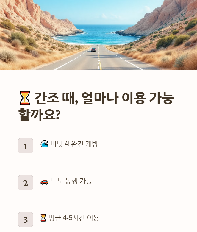 🔹 간조 시간 전후로 6~7시간 동안 통행 가능