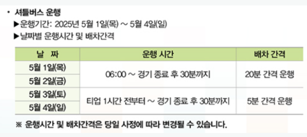 • 모든 관람객은 셔틀버스를 이용해 대회장으로 이동해야 합니다.