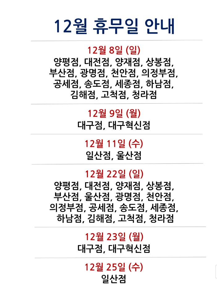 전체 점포 12월 휴무일