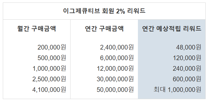 이그제큐티브 회원은 연간 구매금액의 2%를 리워드로 적립하실 수 있습니다.