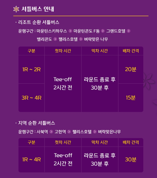 - 배차간격: 1~2라운드 20분, 3라운드 및 최종라운드 15분