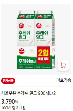 - 서울우유 후레쉬 밀크 - 3,790원 (900ml×2입)