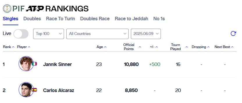 2025년 남자 테니스 세계 랭킹 순위 심층 분석