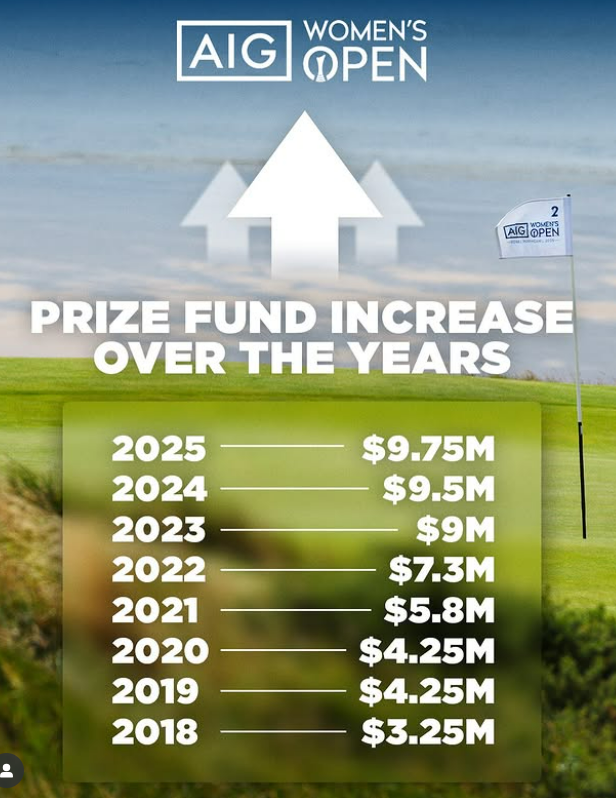 AIG 여자오픈은 2018년 총상금 325만 달러에서 2019년 AIG가 타이틀 스폰서로 참여한 이후 2020년을 제외하고 해마다 상금을 증액했다. 2019년과 2020년 450만 달러, 2021년 580만 달러, 2022년 730만 달러, 2023년 900만 달러, 2024년 950만 달러에서 올해 975만 달러에 이르러 1000만 달러 개막을 눈앞에 뒀다.
