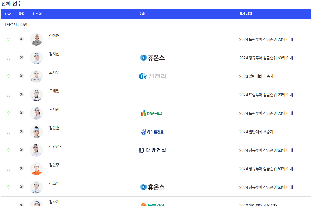 - 박현경(24), 배소현(31), 박지영(29), 황유민(22), 김수지(28) 등 KLPGA 주요 선수들 출전