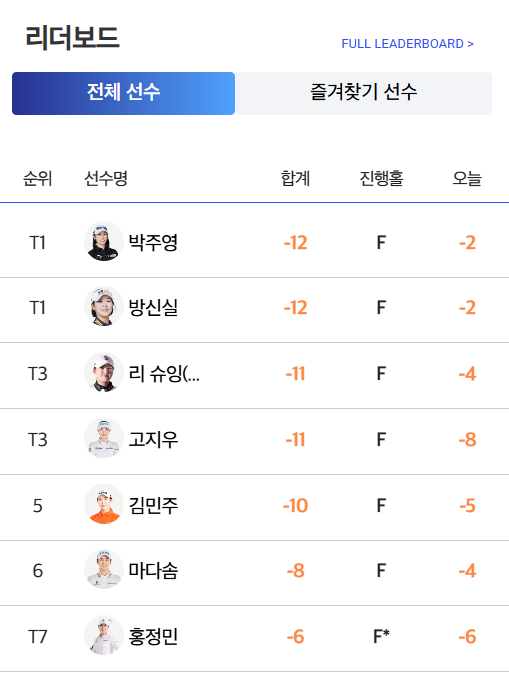 현재 공동 선두인 박주영과 방신실(12언더파)에 이어 고지우와 리슈잉(중국)이 공동 3위(11언더파)로 1타 차 추격 중이며, 김민주가 단독 5위(10언더파), 마다솜이 단독 6위(8언더파)를 기록하고 있습니다.