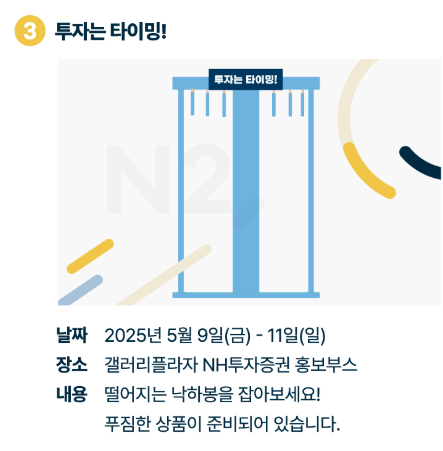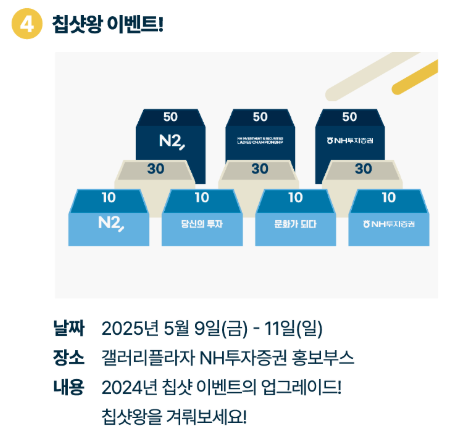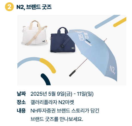 - 'N2, 포토존'과 NH투자증권 홍보 부스에서는 누구나 참여할 수 있는 현장 이벤트가 진행됩니다.